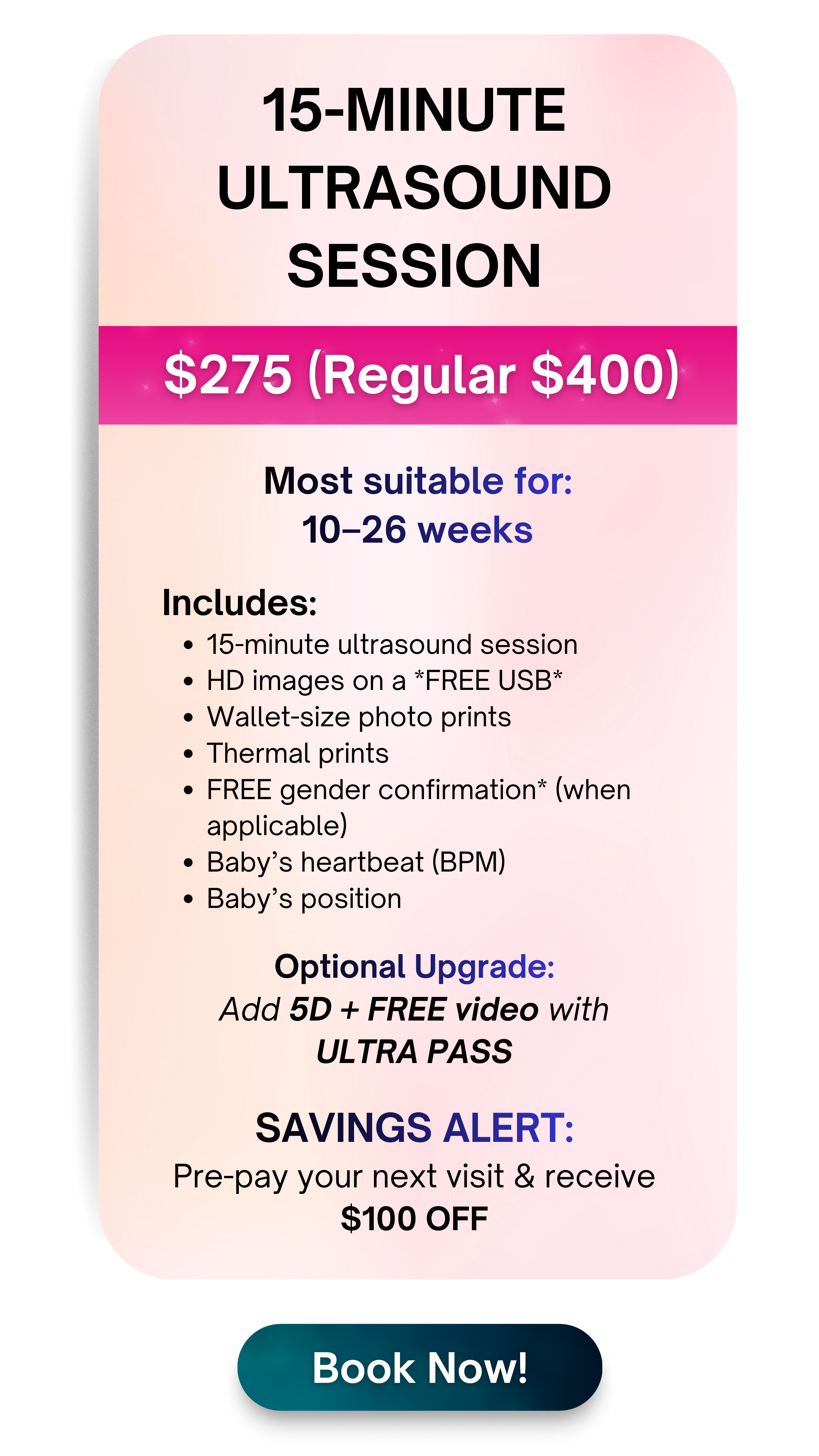 Elective Ultrasounds (2D/3D/4D/HD) can only be performed on pregnant women who are under the care of a physician. Please call us if you have any questions regarding elective ultrasounds.